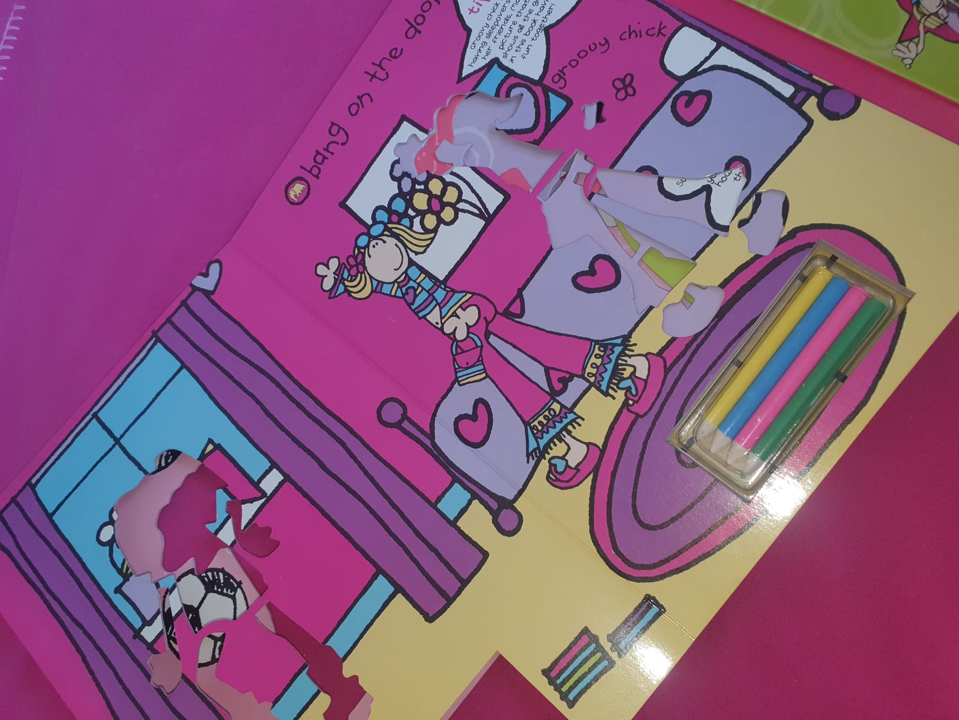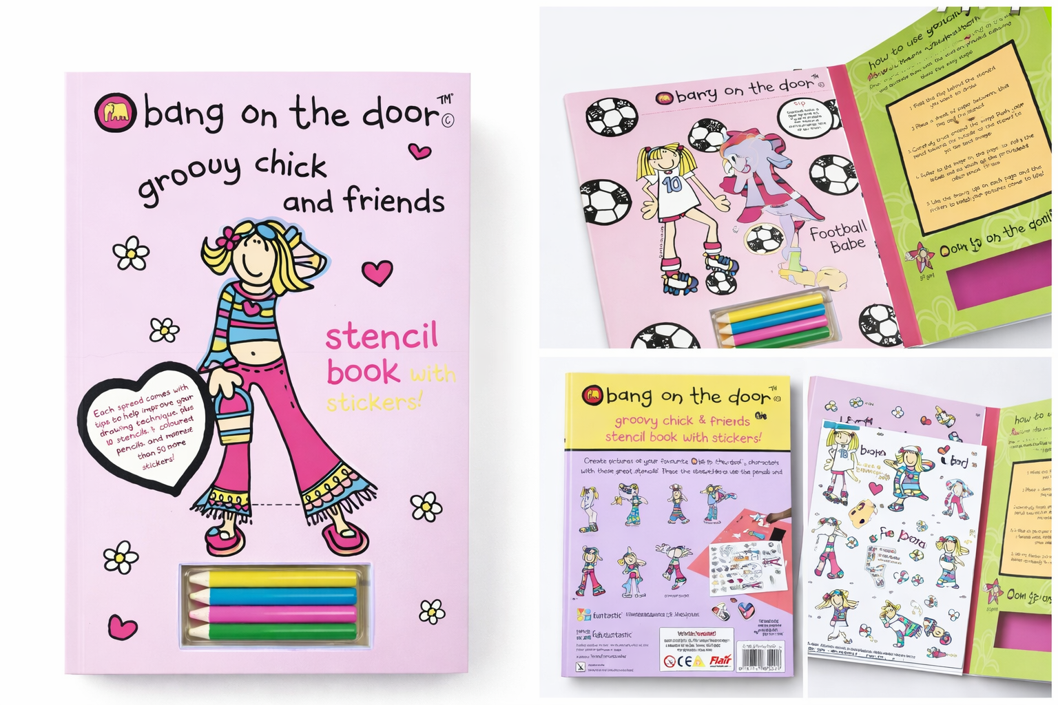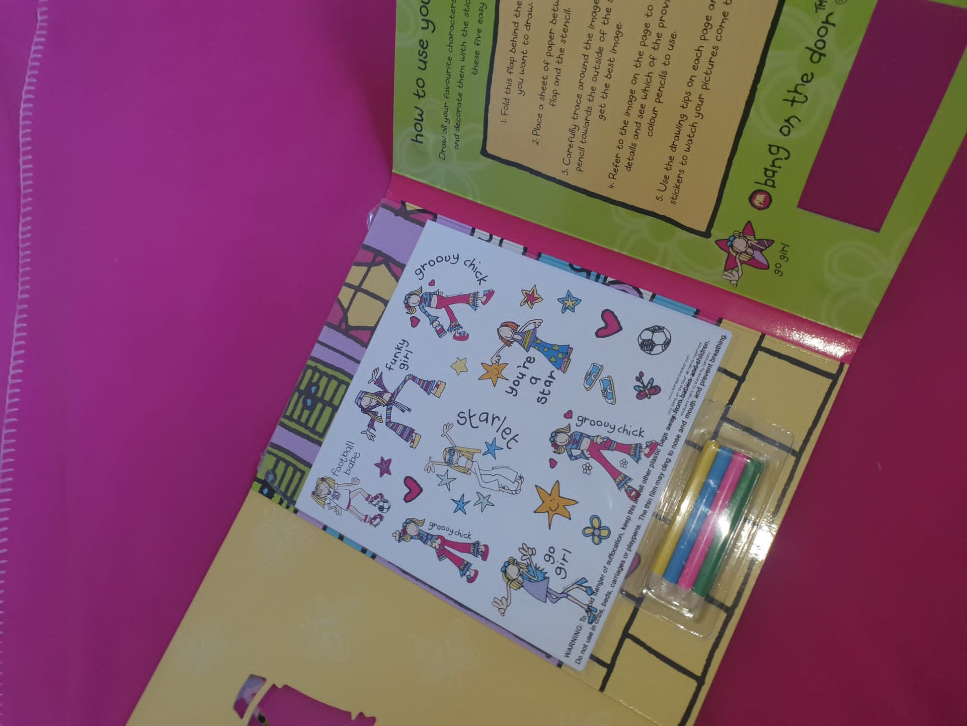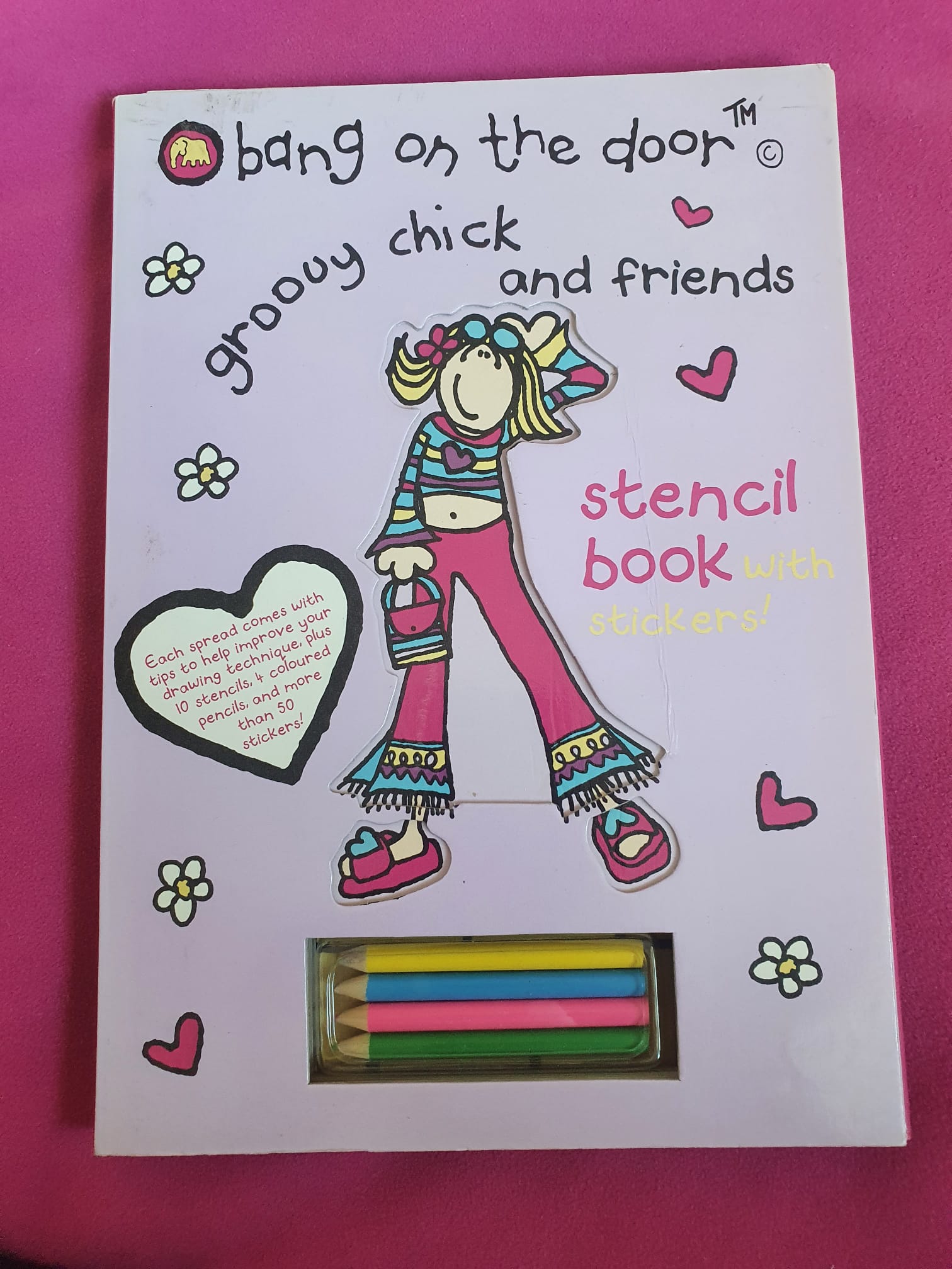 A rare original Bang on the Door Groovy Chick & Friends stencil book, complete with stickers and coloured pencils.