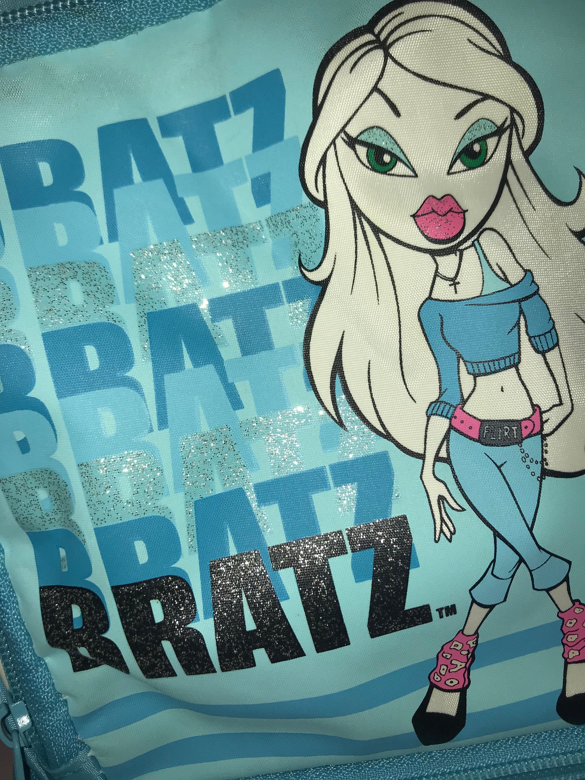 The bag features a structured shape, zip-around opening, carry handle, and original Bratz branded zipper pull. Ideal for use as a lunch bag, mini storage bag, or display piece for Bratz collectors and Y2K lovers.