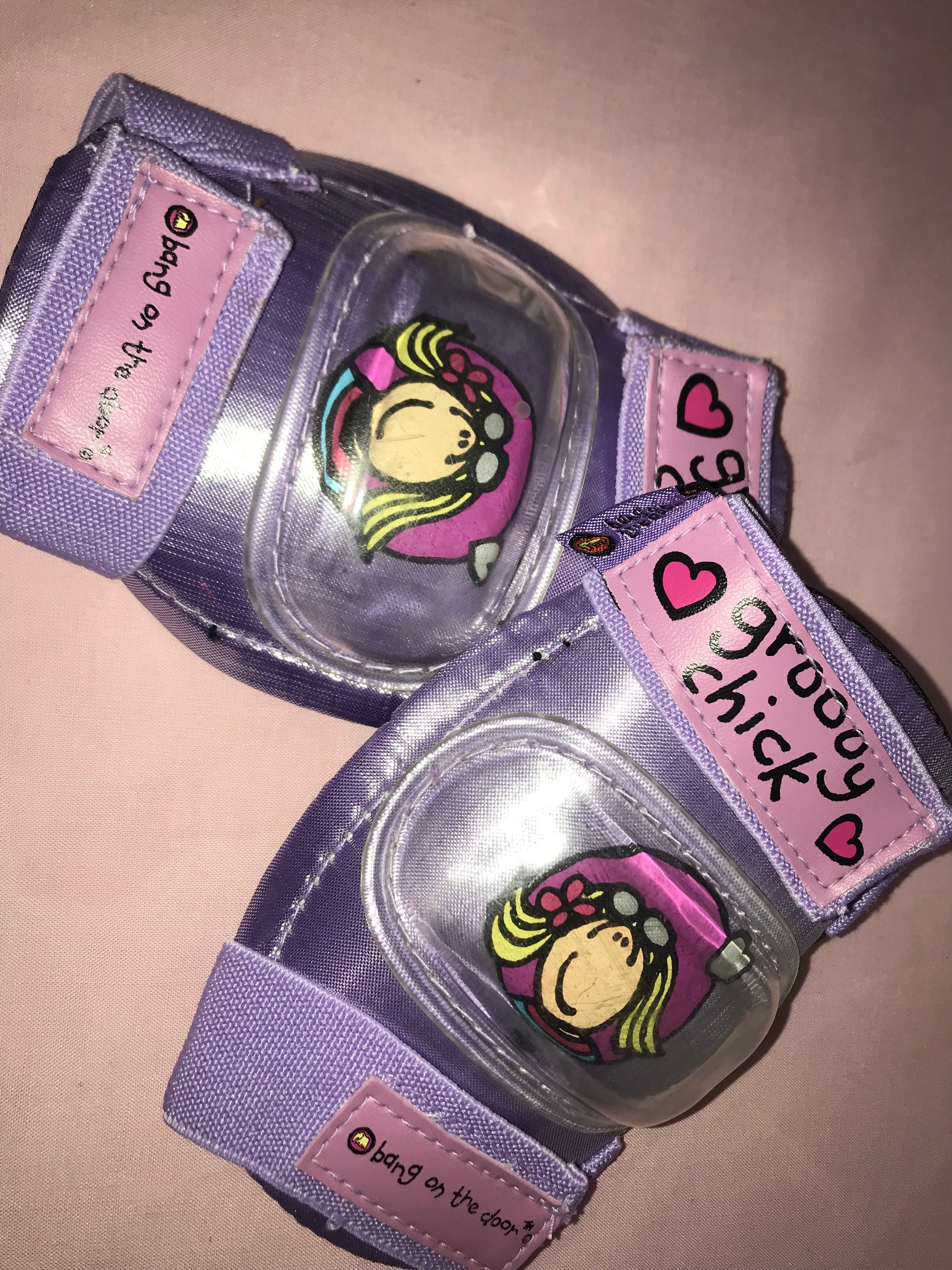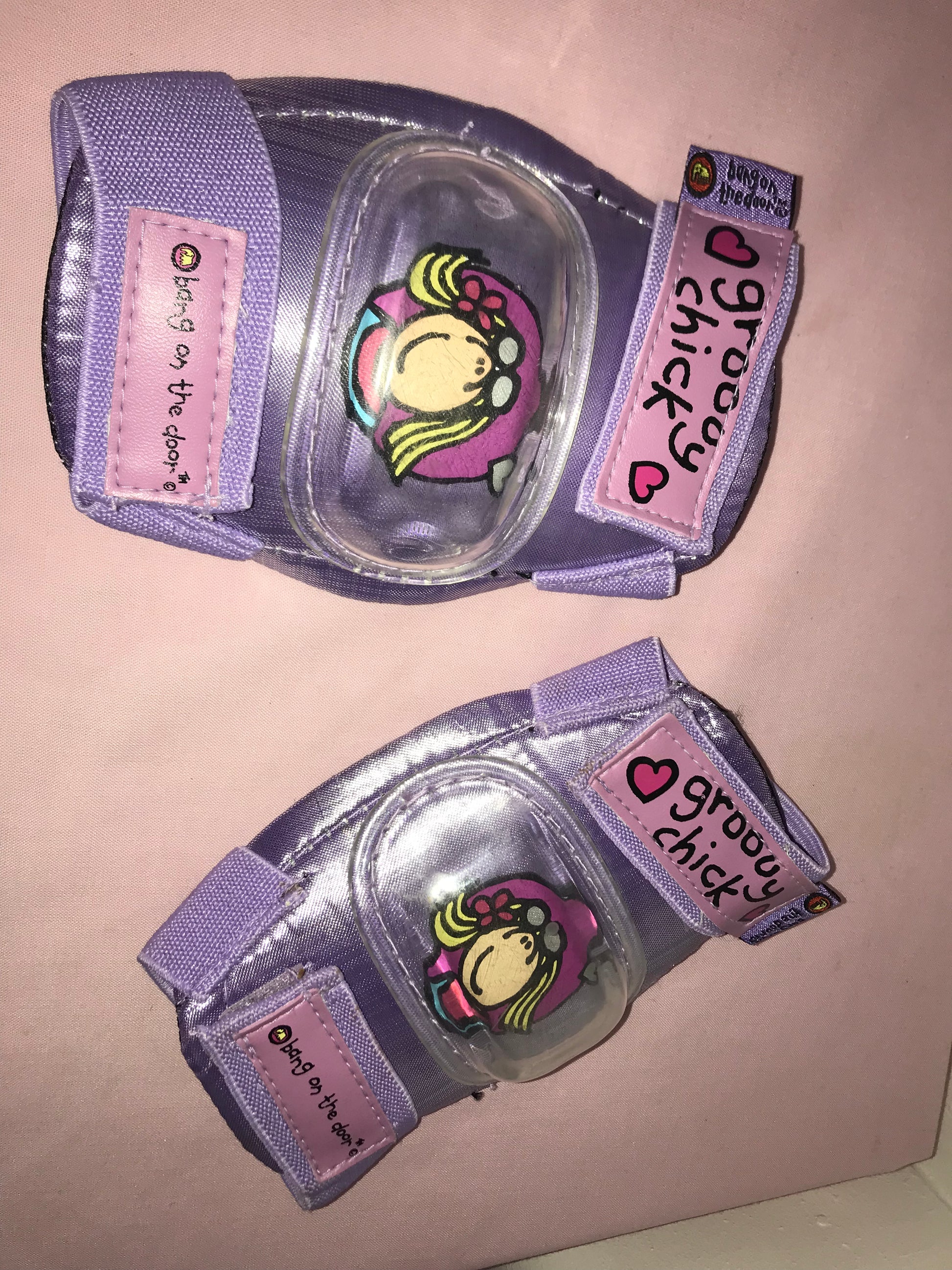 "Groovy Chick" elbow pads from the early 2000s, featuring the iconic Groovy Chick design by Bang On The Door. A genuine Y2K protective accessory that perfectly captures the playful, nostalgic style of the era.